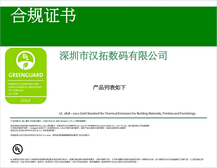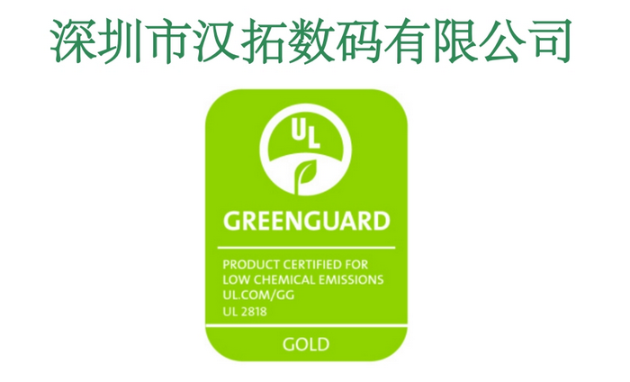 在全球可持续发展浪潮与制造业绿色转型需求的同频共振下,UV打印机国内高端品牌汉拓数码再次以核心实力赢得国际认可。公司旗下多款UV墨水成功通过全球严苛的环保认证之一:UL 绿色卫士金级认证(UL GreenGuard GLOD )。