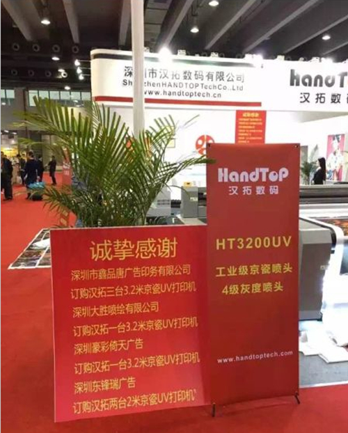 2016年2月24-27日汉拓数码参加广州国际标识及LED展览会,此次展会汇聚广告行业各种前沿趋势及新技术、新材料等的展示,众多新时代科研成果。展会上汉拓的参展产品获得了众多观展人士的一致好评,在展会参展过程中就有客户当即定下10台京瓷喷头UV打印机的优秀业绩,足以证明汉拓数码的UV打印机在打印效果与机器质量上无可挑剔。