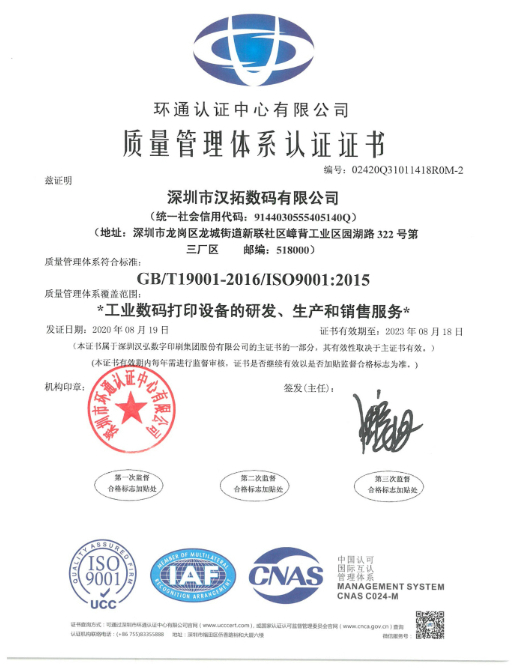 作为uv打印机行业的知名研发生产厂家,汉拓数码一直坚持以欧美质量为标准,严格遵循质量管理体系,力求为客户生产出质量硬、效率高、精度好的uv打印机。汉拓数码的产品质量在市场上的口碑是相当不错的,质量的稳定性也获得了业内的普遍认可,也是行业内为数不多的坚持走自主创新的高新技术企业。2020年4月底公司启动IS09001: 2015质量管理体系认证,质量中心严格按照IS09001: 2015质量管理体系标准( GB/T1901-2016),对各公司的认证范围、体系策划、文件的编写与发布、试运行、内审、管理评审、一阶段及二阶段进行现场审核,于8月22日收到认证中心签发的证书。