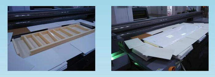 由于面板属于板料,使用uv平板打印机就可以胜任。部分家电面板有支架,直接在uv平板打印机上打印高低不平,易刮到喷头,且小车与台面过高,边沿UV光易反射到喷嘴造成瞬间堵孔。下面将详细讲述这类面板的打印方法。