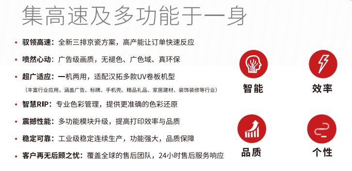 2021年广州迪培思春季广告展上,汉拓数码推出全新的京瓷喷头应用解决方案—三排京瓷,多功能模块升级,提高印刷效率和质量适用于汉拓多款UV卷板一体打印机,涵盖广告、标牌、手机外壳、精品礼品、家居建材、装饰等行业。这是汉拓UV打印机在京瓷喷头应用升级上的又一个成功案例。