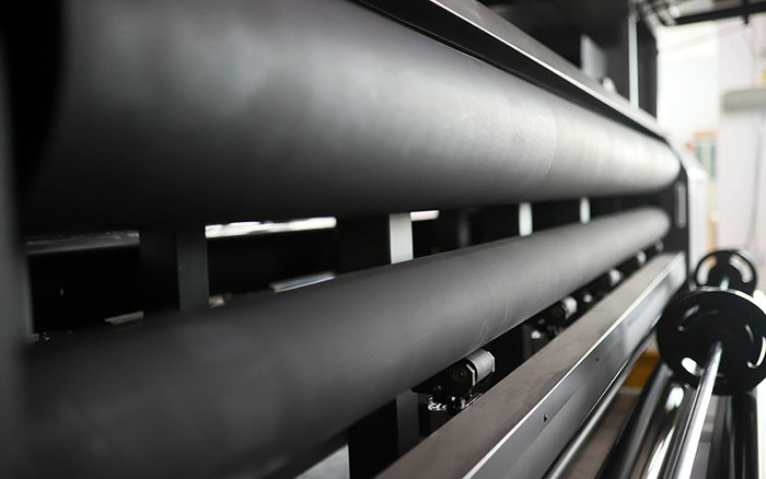 Turbo采用汉拓全系列UV打印机都有配置的京瓷方案,搭载汉拓第二代京瓷头板生产模式下产能可达到155㎡/h。Turbo的前后双辊托卷经过汉拓工程师的调试,平行精度可达到0.01mm级别,配合双驱动的稳定送料,用户在打印卷材时只需简单放置即可进行持续印刷。独特的悬空送料设计,进一步提升了设备对材料的兼容性。
