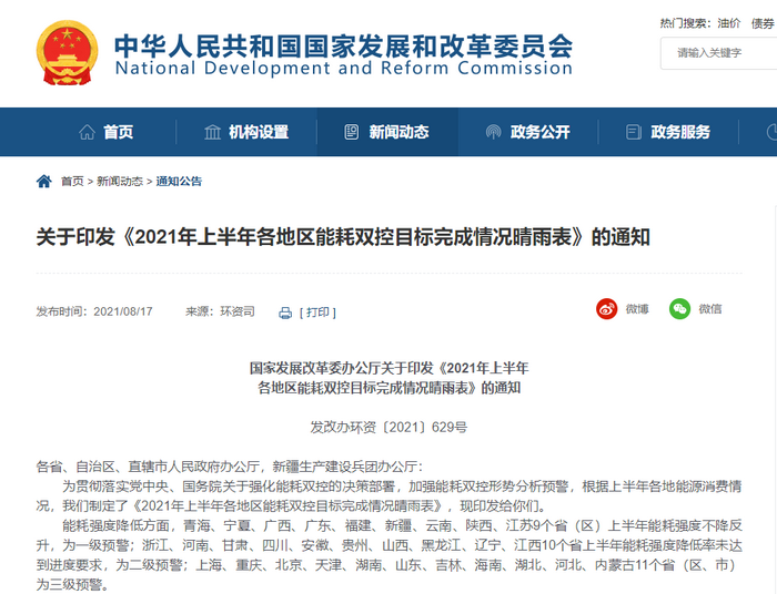 那么,国家为什么突然要进行限电政策呢?纵观今年的商品市场,受煤炭价格大幅上涨且持续高位运行影响,国内电力面临供需紧张局面,许多发电企业边发电边亏损,但国家规定电价不能随行就市轻易调整。另外,随着“碳中和”概念的提出,国家对各省份也制定了能耗双控的目标。8月份国家发改委对各地区能耗的调查数据显示,多个省份已经亮起红灯,形势十分严峻。