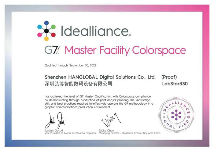 近日,UV打印机高端品牌汉拓数码兄弟公司弘博智能工业级数字标签机LabStar 330获得了美国IDEAlliance(国际数码企业联盟)颁发的G7认证最高级别认证证书—G7 ColorSpace级别,成为国内首台通过G7最高级别认证的数字喷墨标签机。弘博智能也因此成为中国数字喷墨印刷设备领域鲜有的获得G7最高级别认证的设备厂商。